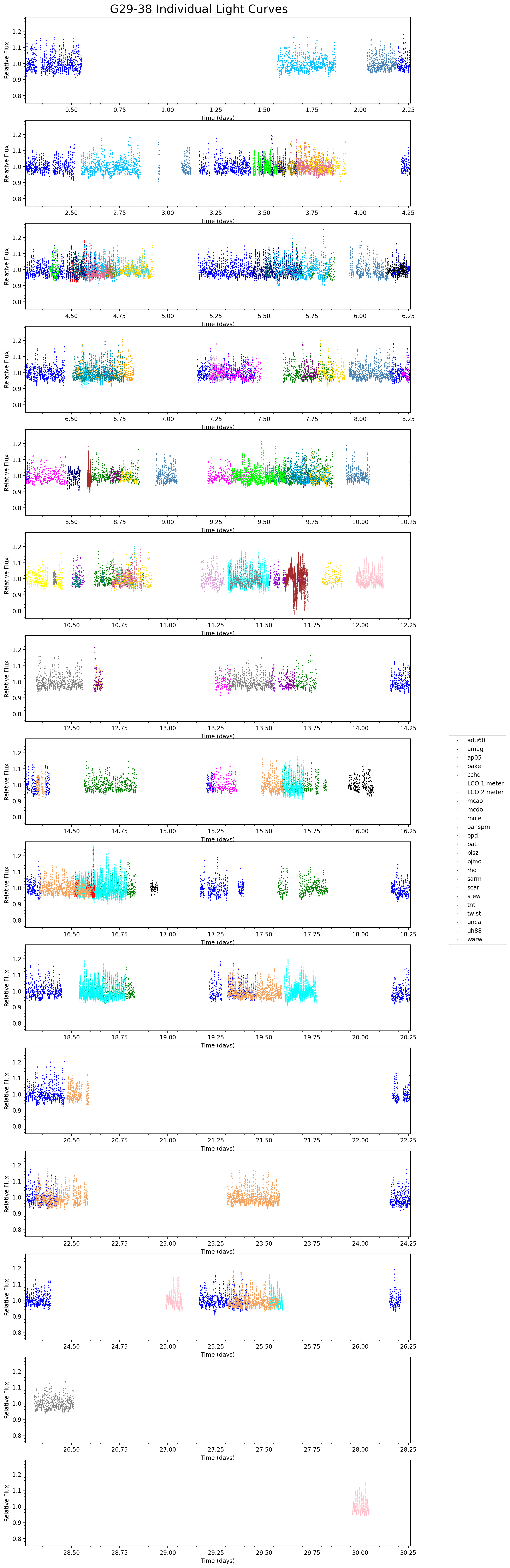 A wrapped plot showing the G29-38 visible data taken over the full XCOV 31 campaign, from October 13th through November 10th. Each subplot spans two days and shows the optical observation data organized by telescope/observatory that gathered the data. The LCO 1 meter data was taken by several telescopes at the follwoing Las Cumbres observatory sites: Teide, CTIO, and McDonald. All of the LCO 2 meter time was gathered by Siding Springs Observatory.